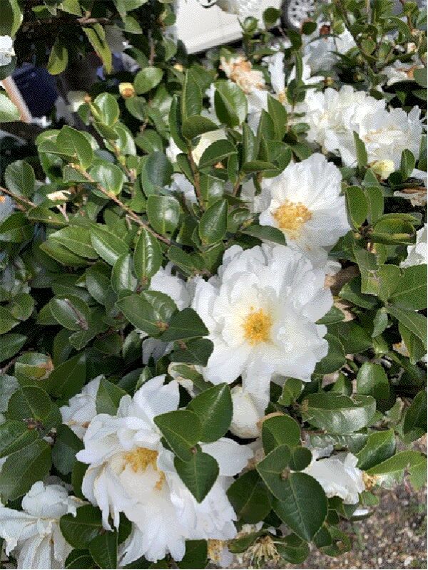 何の花だろう? 葉っぱは椿の様だ。花の形も椿の様。こんな純白の椿が有ったのか。
