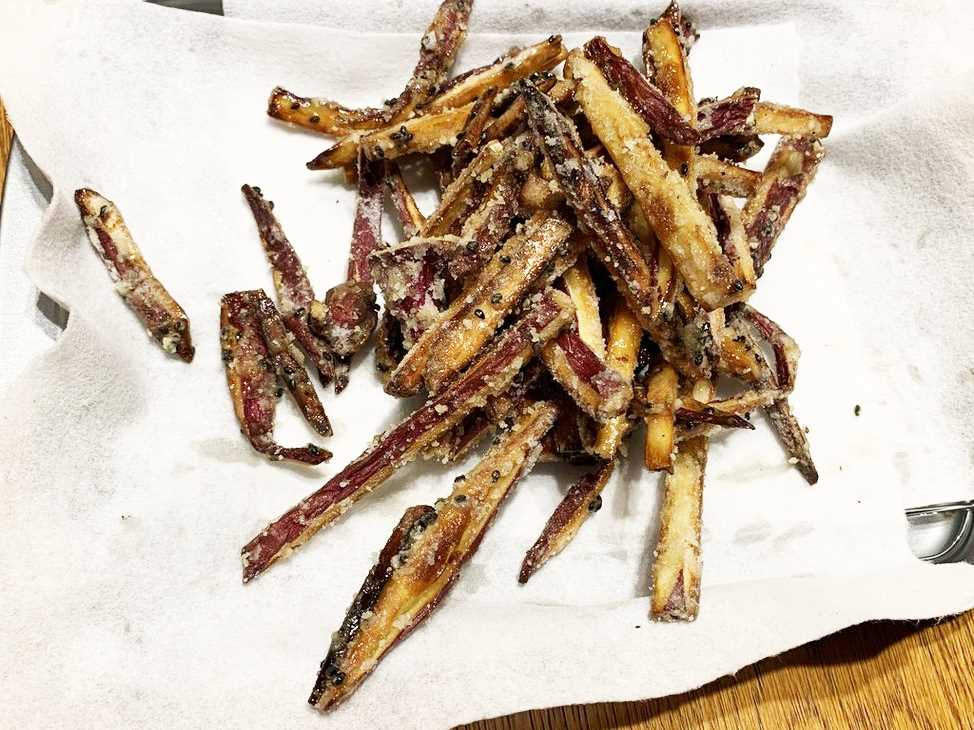 中火でトロリとするまで軽く煮詰める。 - 揚げたての芋皮を加え、絶えず混ぜる。
