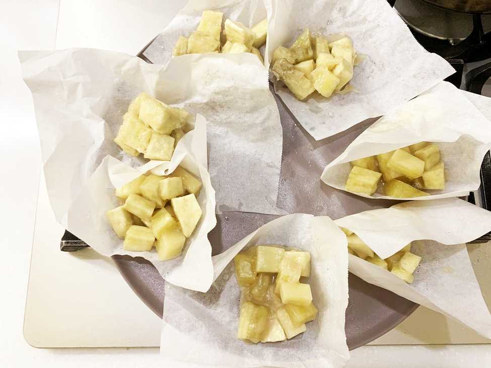下にたまった砂糖水も利用する。 - 12分間強火で蒸す。